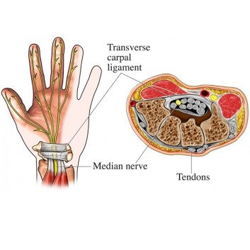 손목터널이란 손목의 뼈와 횡수근인대로 이루어진 공간으로 손과 손가락을 굽히는 인대와 손바닥의 감각을 담당하는 정중신경이 지나가고 있습니다. 손목의 과사용 등으로 인해 횡수근 인대가 두꺼워지면서 터널 내부의 구조를 압박하게 되면 손바닥과 손가락의 저린 느낌과 통증이 발생합니다.