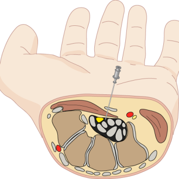 염증을 가라 앉일 수 있도록 손목터널 내부에 주사를 하게 되면 손목터널에 대한 압박이 감소 하면서 증상이 경감 됩니다. 하지만 반복적인 주사에도 증상이 재발하거나 호전이 없다면 수술적 접근으로 횡수근인대를 절개하여 손목터널에 대한 압박을 제거해야 합니다. 치료시기가 늦어지게 되면 손바닥 근육의 위축이 발생하며 이는 횡수근인대를 제거 하더라도 복원 되지 않습니다.